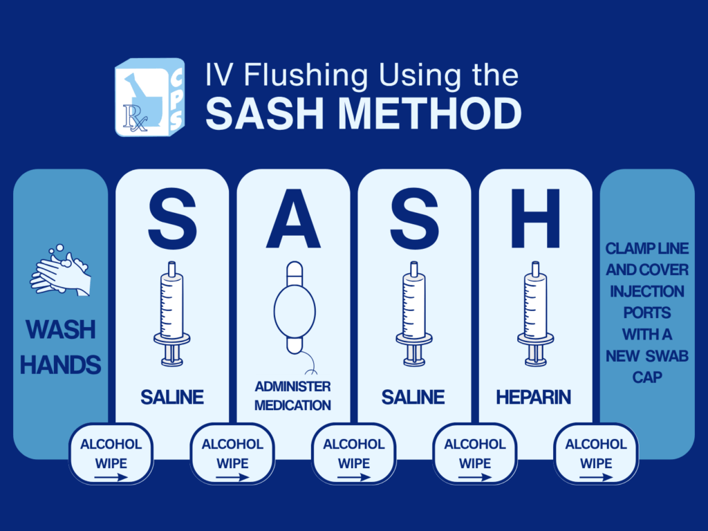 You’ll use the SASH technique to flush your line before and after medication administration and once daily for any unused IV lumens.